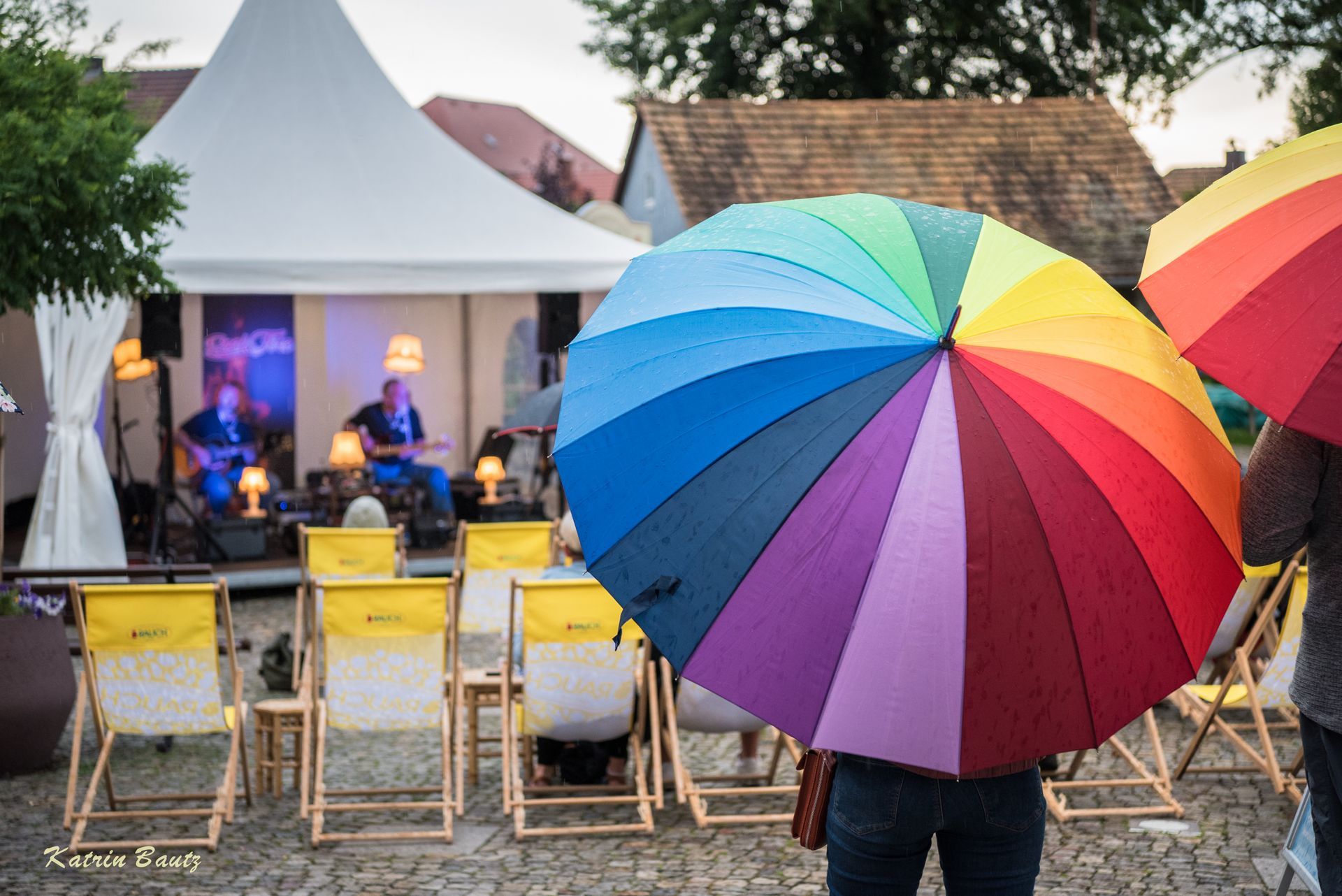 Mit Schirm und Kapuze bewaffnet wurde dem kurzen Regenschauer getrotzt und anschließend der Abend mit einem Getränk in der Hand genossen und kräftig mitgesungen.
